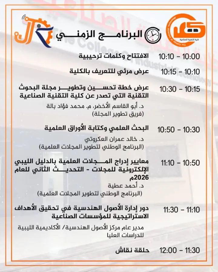 نظمت كلية التقنية الصناعية بمصراتة صباح يوم الخميس الموافق 02 أكتوبر 2025، ورشة عمل مكثفة وهامة حول تطوير المجلات العلمية الليبية. أُقيمت الورشة في مدرج الكلية، بالتنسيق مع فريق "برنامج تطوير المجلات العلمية" التابع لوزارة التعليم العالي والبحث العلمي.